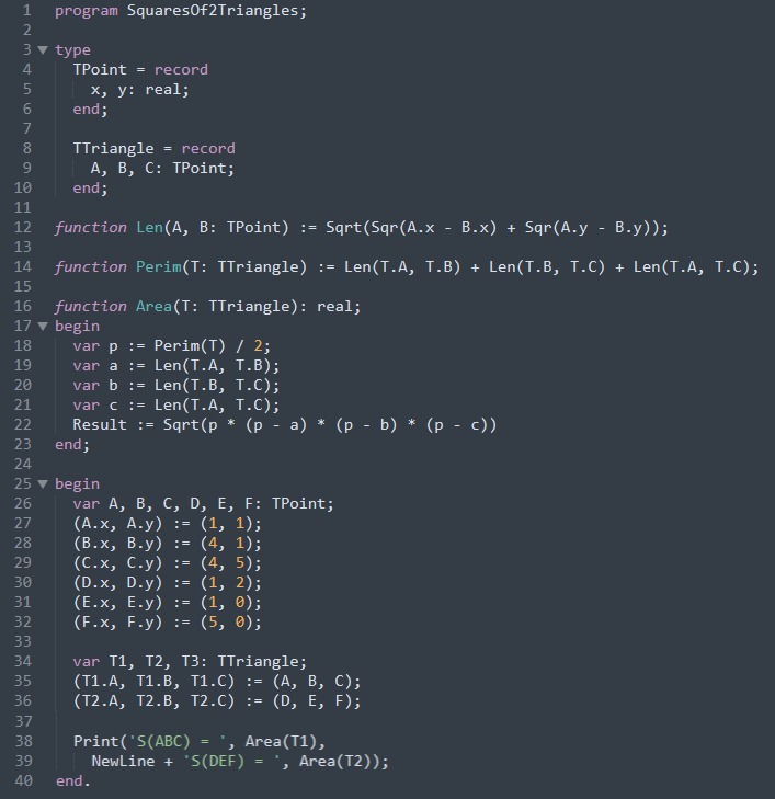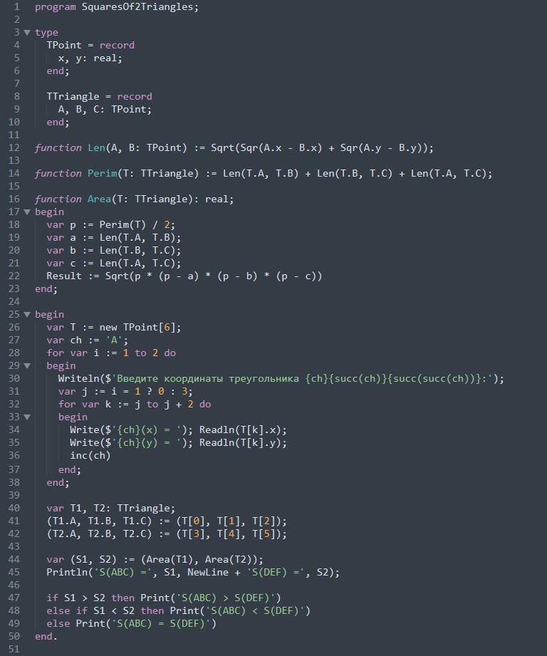 1. Даны координаты вершин двух треугольников. Написать программу, позволяющую определить, площадь которого из них больше, используя для этого подпрограмму вычисления площади треугольника.