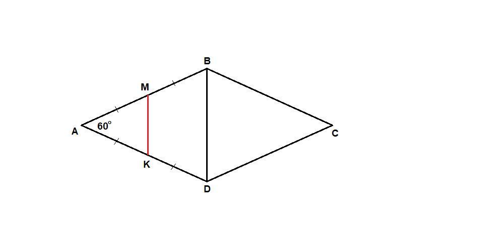 Периметр ромба ABCD равен 24 см, угол А=60°. Найдите среднюю линию МК треугольника АBD, где М€AB, K€AD