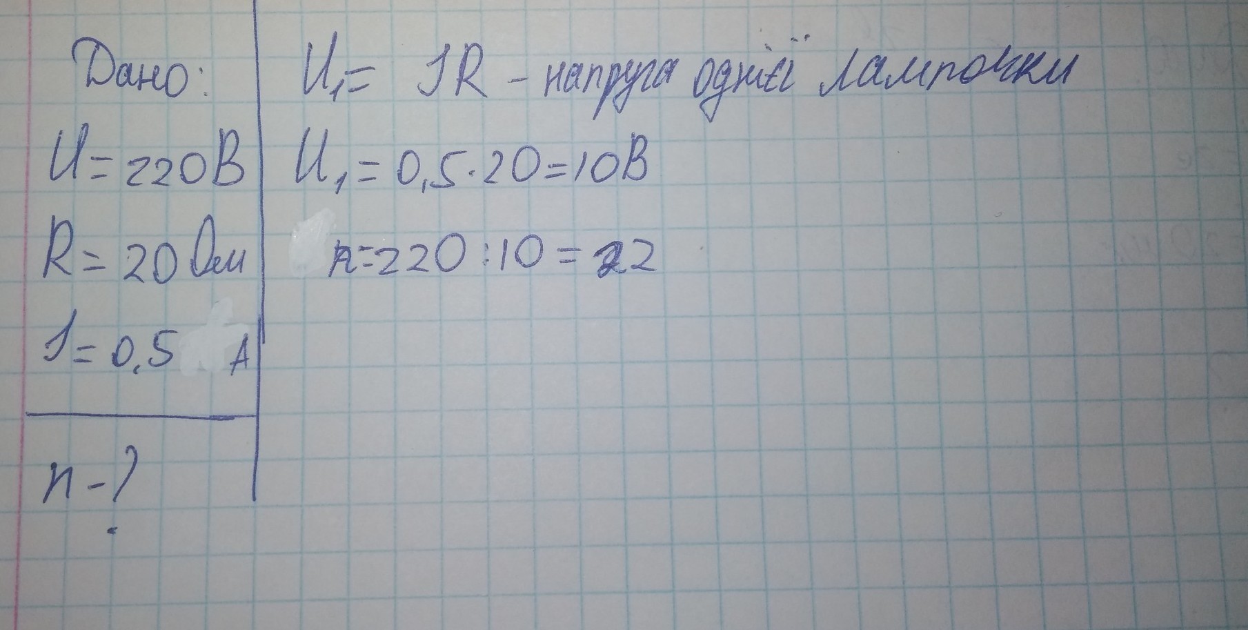 Скільки послідовно з’єднаних електро лампочок треба взяти для ялинкової гірлянди щоб її можна було включити в мережу напругою 220 В якщо кожна лампочка має опір 20 Ом і горить повним напруженням при силі струму 0,5 А ?