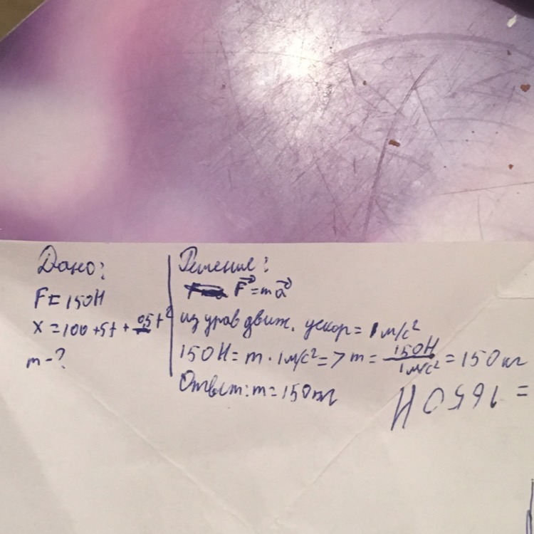 Под действием силы 150 Н тело движется так, что его координата в направлении действия силы изменяется по закону x=100+5t+0,5t2. Какова масса тела?
