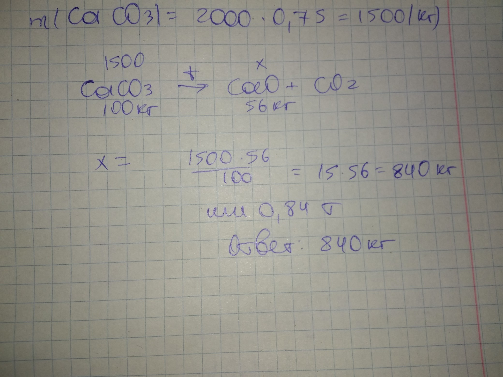 вычислите количество вещества НЕгашёной извести, которое может быть получено из 2 т известняка, содержащего 25% примесей. Прошу заметить НЕГАШЁНОЙ...