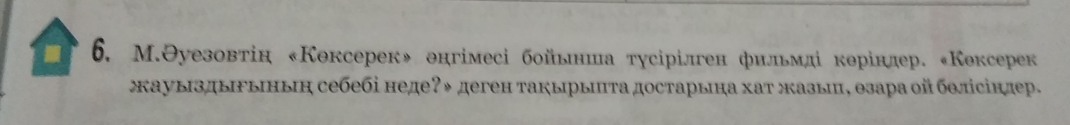 Мұхтар Әуезов "Көксерек" әңгімесі бойынша түсірілген фильмді көріңдер. "Көксерек жауыздығының себебі неде?" деген тақырыпқа достарыңа хат жазып, өзара ой бөлісіңдер.