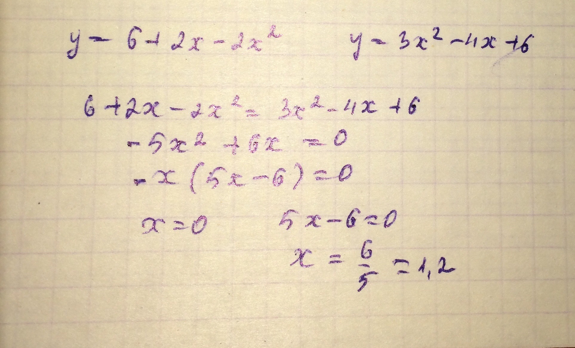 Приравниваем оба уравнения и решив его найдём точки пересечения. На фото найден х, зная х найдём у подставив х вилюбое из уравнений: