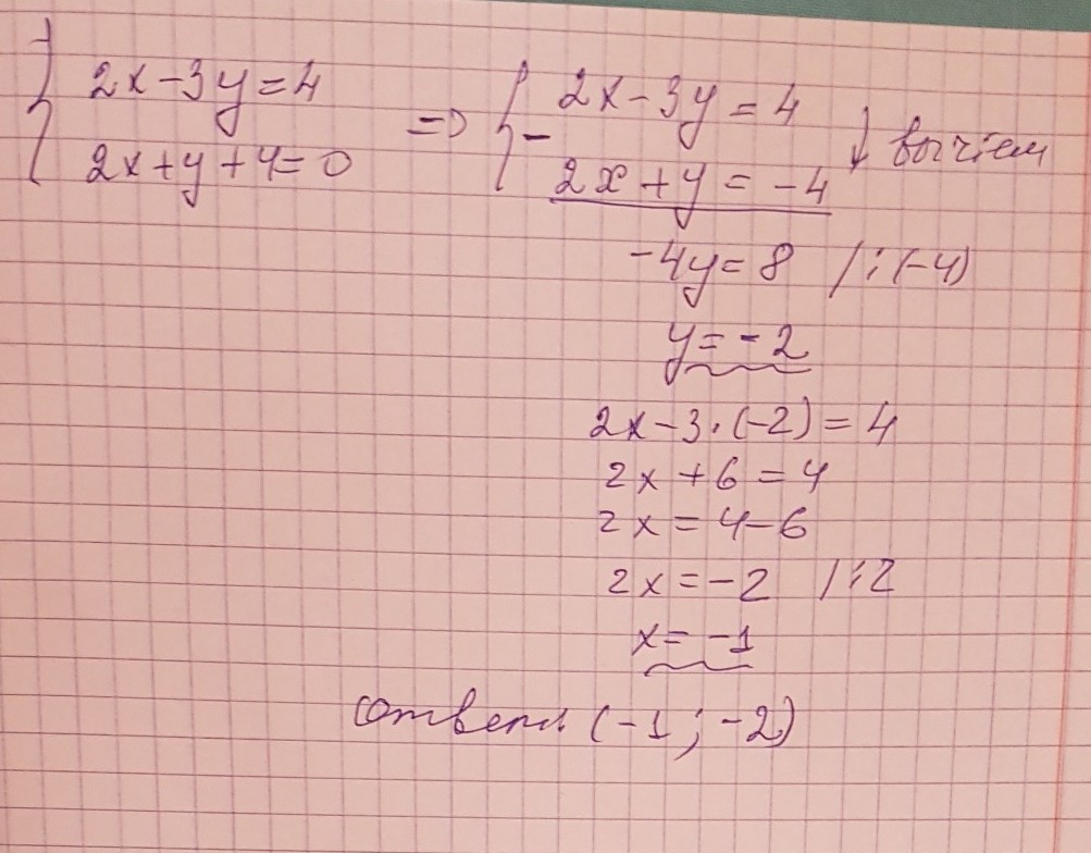 СРОЧНО У МЕНЯ ТОЛЬКО 20 МИНУТ ЕСТЬ решите систем линейных уравнений с двумя неизвестными способом сложения 2х-3у=4 2x+у+4=0