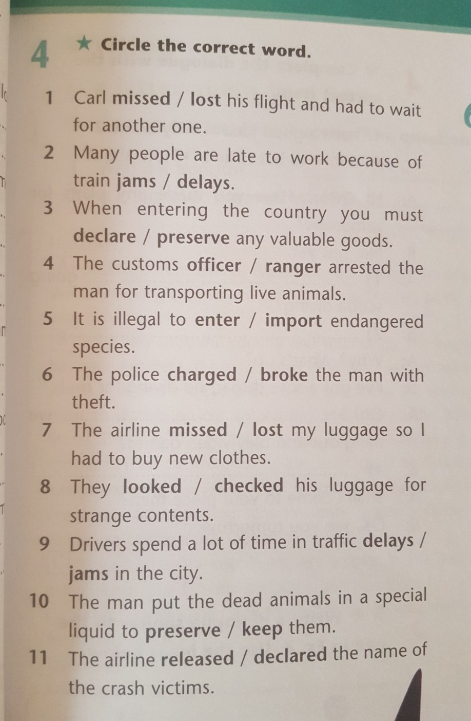 1. lost 2. delays 3. declare 4. oficcer 5. import 6. charge 7. lost 8. checked 9. jams 10. preserve 11. released