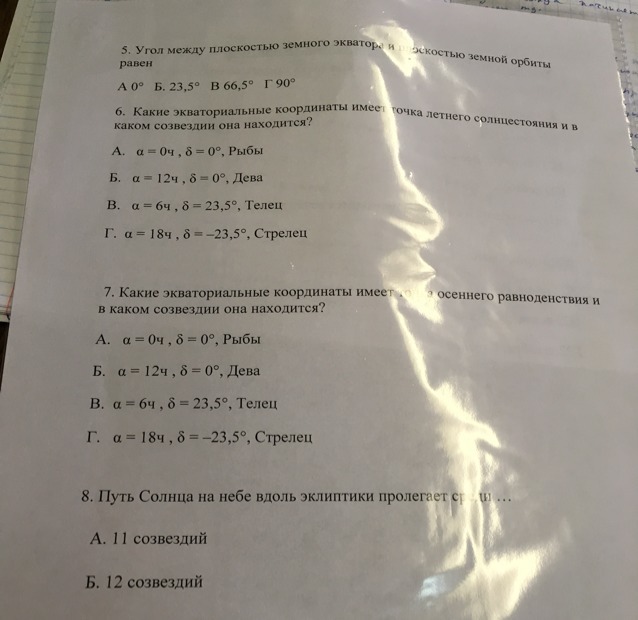 5) Б (Наклон земной эклиптики равен 23,5 градусам)