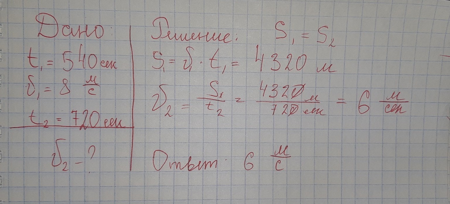 Один велосипедист ехал 9 мин со скоростью 8 м/с,другой проехал тот же участок пути за 12 мин.С какой скоростью он ехал?