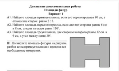 A3. a = 12 см, b = 9 см, C = 30 градусов Площадь треугольника равна части его сторон на синус угла между ними S = (ab) / 2 * sin C S = (9 * 12) / 2 * sin 30 = 54 * 0,5 = 27 кв. см ответ: 27 кв. см