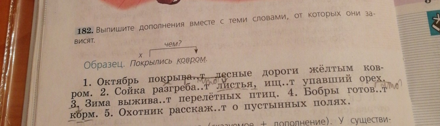 покрывает дороги. желтым ковром. разгребает листья. ищет орех. выживает птиц. готовят корм. расскажет о полях