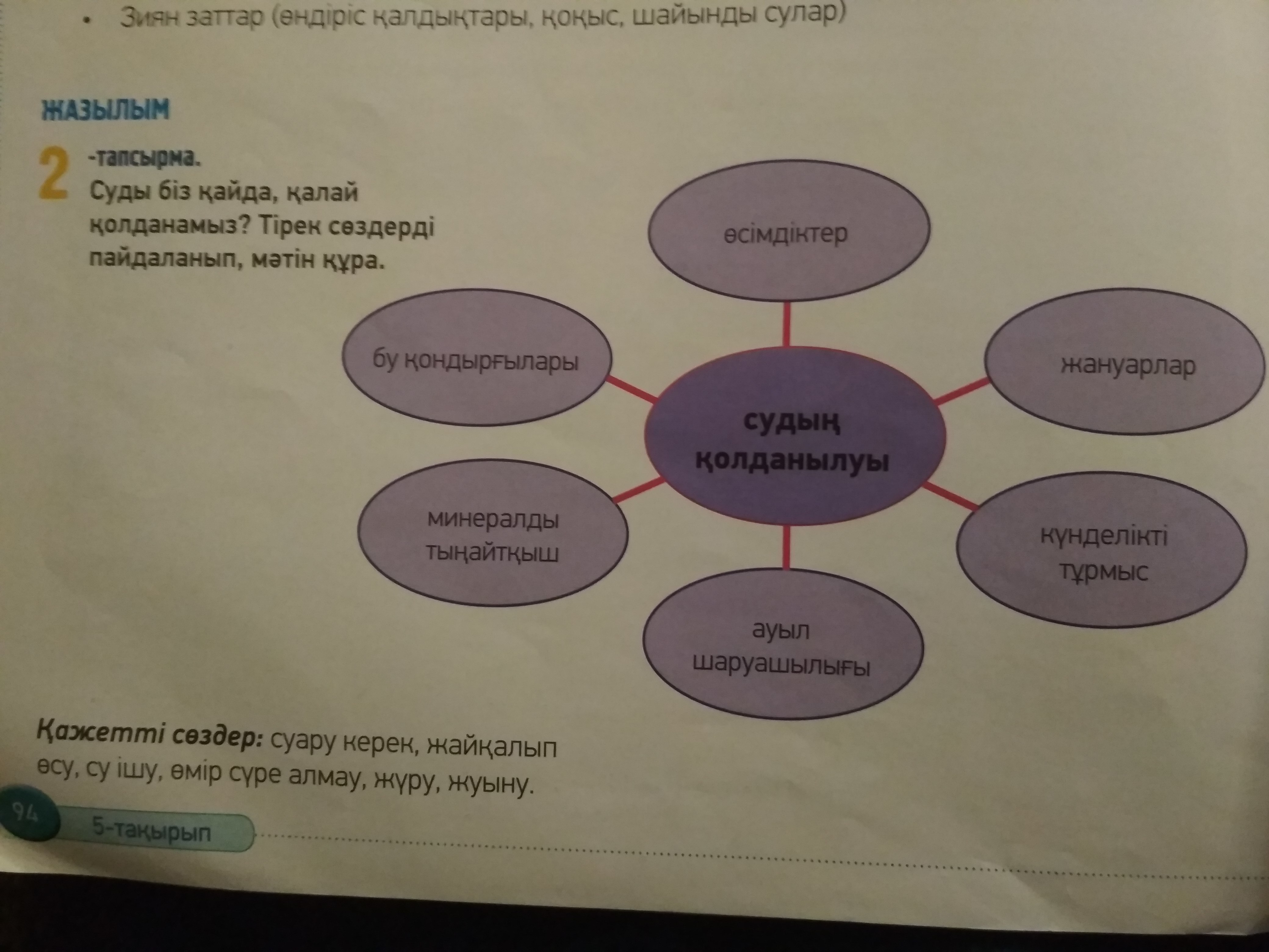 Біз сусыз өмір сүре алмаймыз. Және біз де өмір сүре алмаймыз өсімдіктерге, жануарларға да су керек. Мысалы өсімдіктерді біз суармасақ немесе өмірде су жоқ болса, өсімдіктер өледі. Ал су бар болса өсімдіктер жайқалып өсіп түрады. Және біз, біз су ішпесек өмір сүре алмаймыз. Және де біз сумен жуынамыз, ішеміз, тамақ пісіреміз. Біз сусыз өмір сүре алмаймыз.