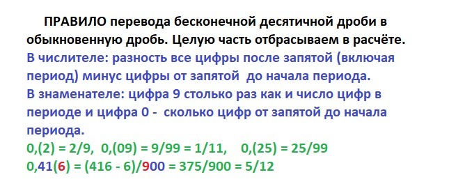 Правила для перевода десятичных бесконечных дробей в обычную дробь приведены на рисунке в приложении.