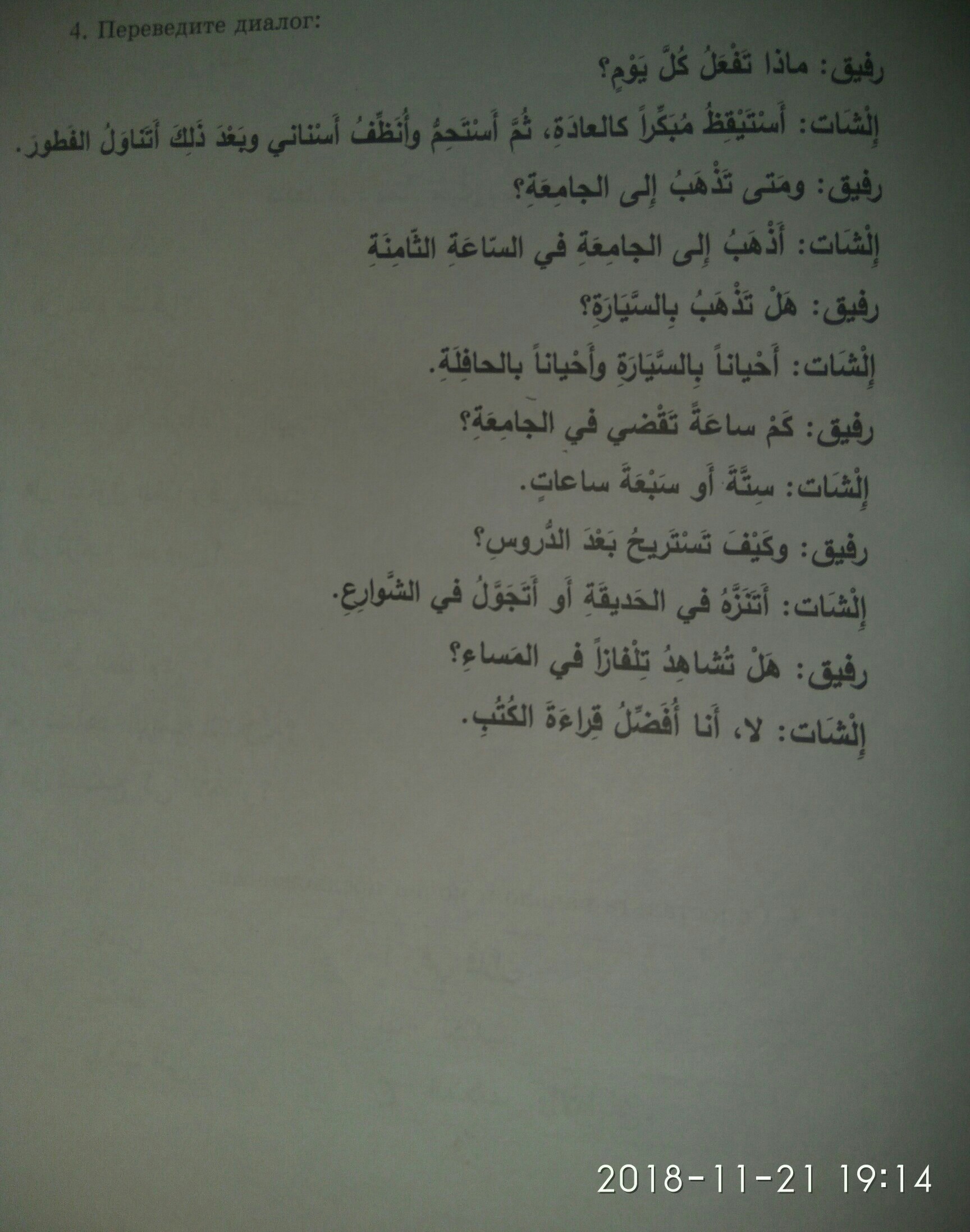 Компаньон: Что вы делаете каждый день? Асхат: Я просыпаюсь рано, как обычно, тогда ты и чистишь зубы, и я ем компаньона для завтрака: Когда ты идешь в университет? Шат: Я хожу в университет в восемь часов. Компаньон: Вы едете на машине? Асхат: Наш брат на машине, а иногда и на автобусе. Компаньон: Сколько часов вы проводите в университете? Ashat: Год или цепочка часов. Компаньон: Как вы отдыхаете дольше? Я иду в сад или гуляю по улицам. Компаньон: Ты смотришь вечер? Ench: Нет, я предпочитаю читать книги.