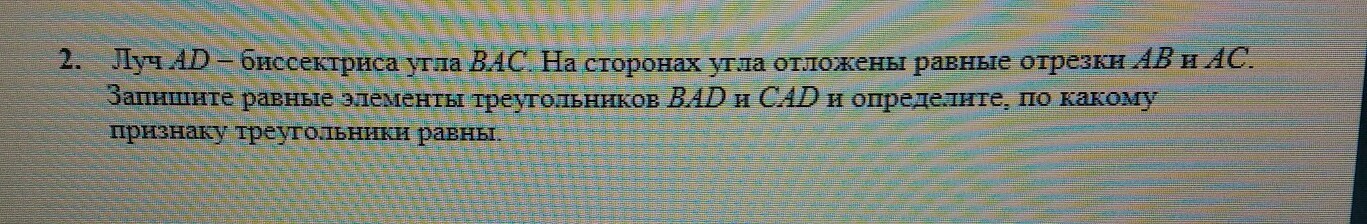 У этих треугольников равные стороны аб и ас, общая сторона ад и рааные углы между ними бад и сад половинки угла бас. Треугольники равны по 2 сторонам и углу между ними.