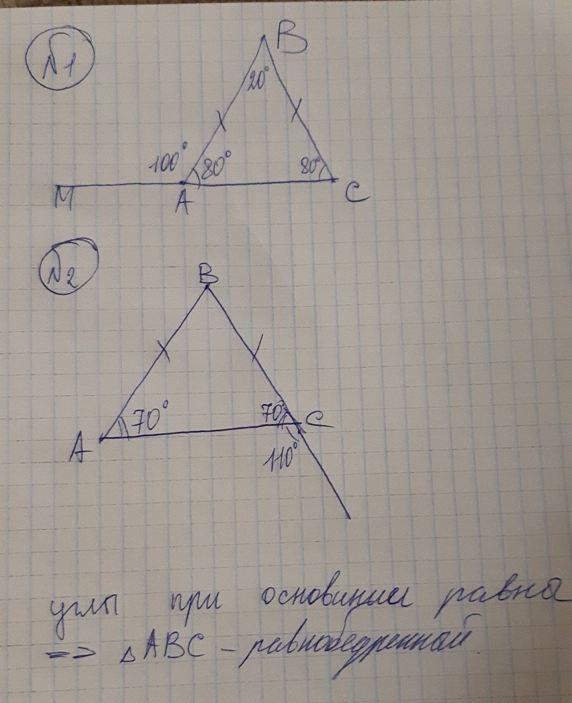 Угол BАС смежный с углом m a б Значит их сумма равна 180 градусов из-за этого зная что Угол ABC равен 100 Найдите угол BАС он равен 80 так как треугольник ABC равнобедренный то угол BCА тоже равен 80.