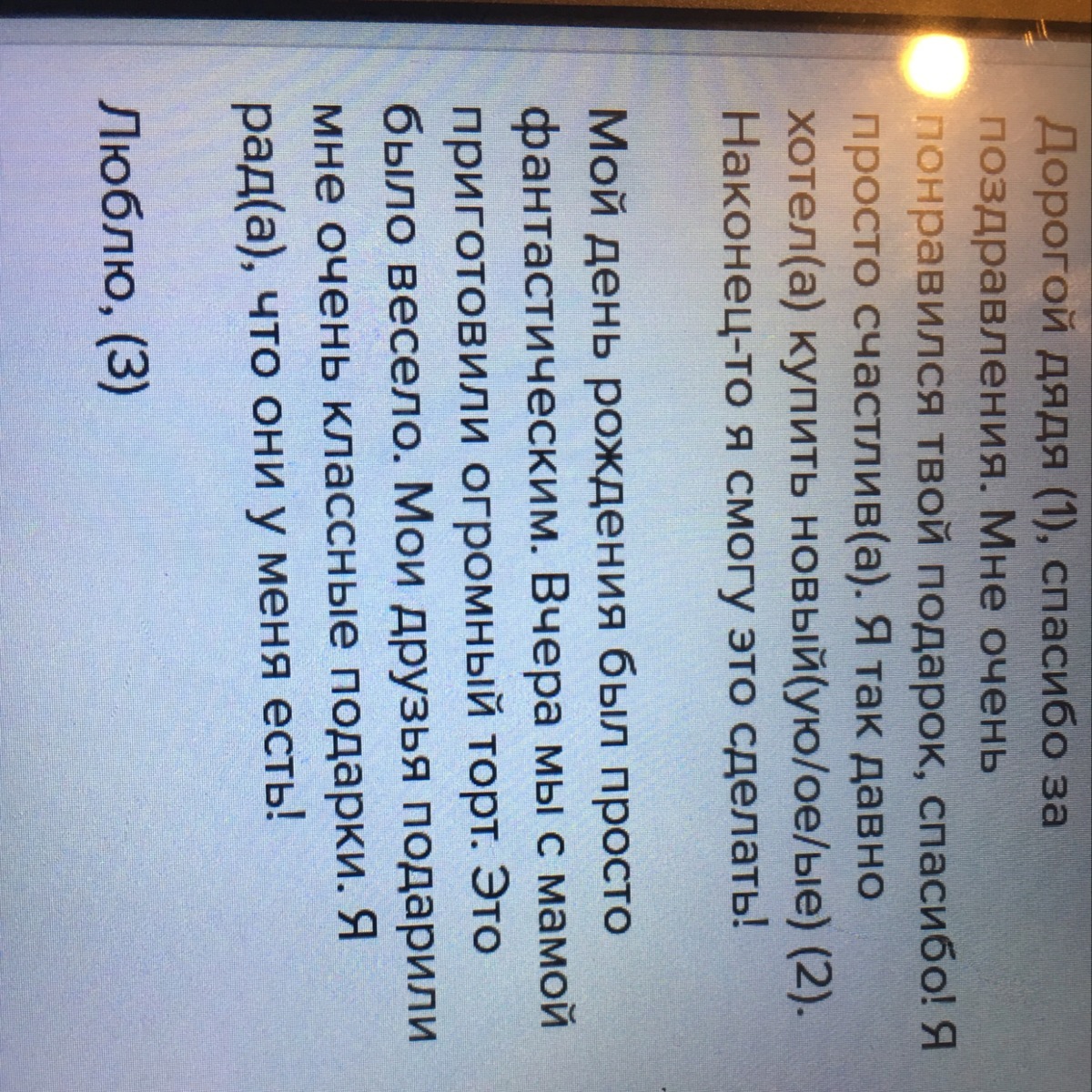 Dear uncle (1), thank you for your congratulations. I really liked your present, thanks! I am so happy. I wanted to buy new ones for so long (2).
