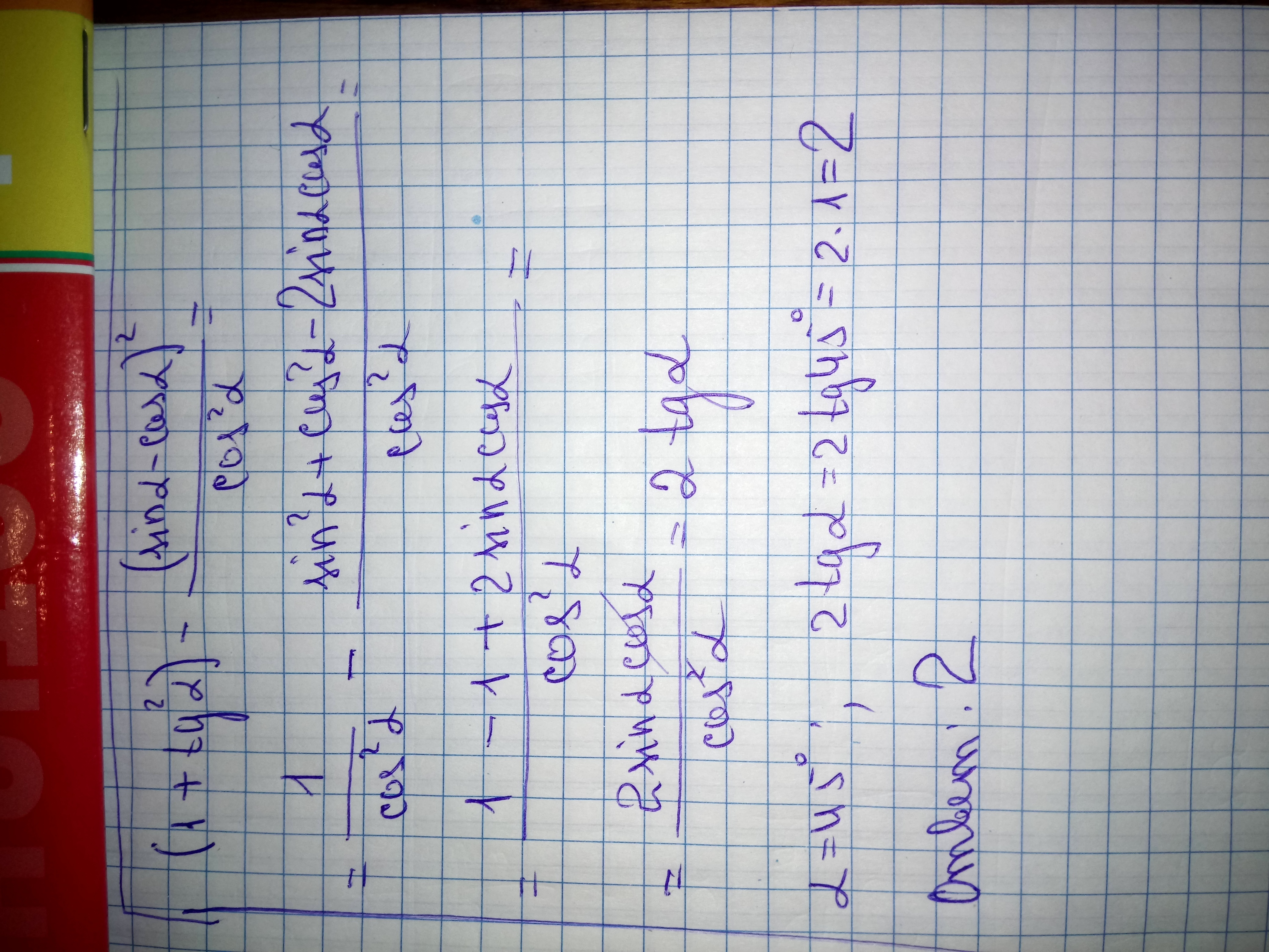 вычислить предварительно упростив выражение: (1+tg^2a)-(sina-cosa)^2/cos^2a ;при a=45