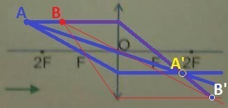 B - источник между фокусом и двойным фокусом [F < d < 2F].
