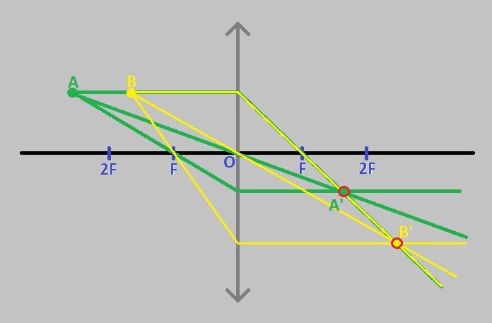 На рисунке обозначил все лучи, которые могли использоваться при построении, на практике достаточно любых двух для одной точки.