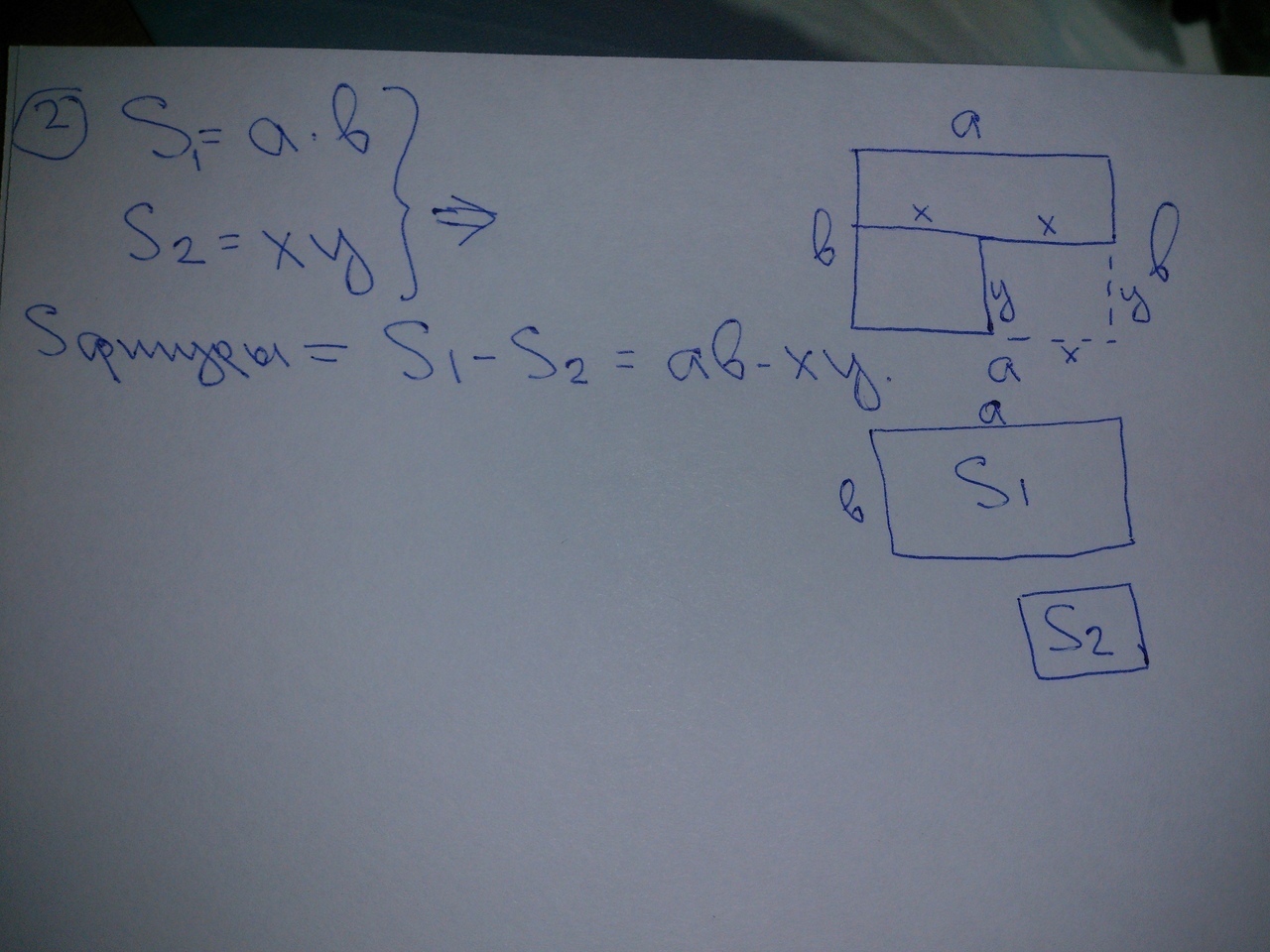 Значит, площадь фигуры S будет равна разности площадей S1 и S2, т.е. S1-S2=a*b-x*y