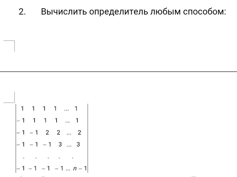верхнюю строчку прибавляешь ко всем другим, получается треугольная матрица, ее определитель равен произведению диагональных элементов. ниже диагонали - нули, а по главной диагонали - числа от 1 до n