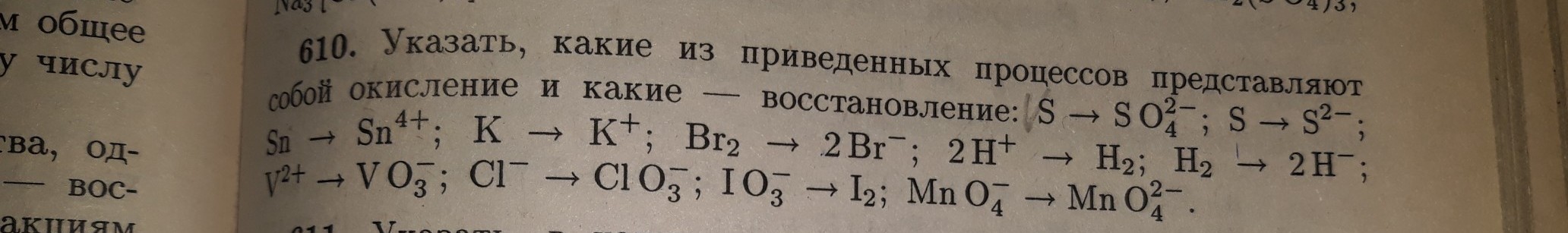 S(0) - 6е = S(+6)O4(-2) окисление; S + 2е = S(-2) - восстановление; Sn(0) - 4e = Sn(+4) окисление; К(0) - 1е = К(+1) окисление; Br2(0) + 2e = 2Br(-1) восстановление; 2Н(+1) +2е = Н2(0) восстановление; Н2(0) +2е = 2Н(-1) восстановление; V(0) - 5e = =V(+5)O3(-2)(-) окисление; Cl(-1) - 6e =( Cl(+5)O3(-2))(-); 2I(+5)O3(-2)(-) + 10e = I2(0) восстановление; Мп(+7)О4(-2))(2-) + 1е = Мп(+6)О4(-2))(2-) восстановление