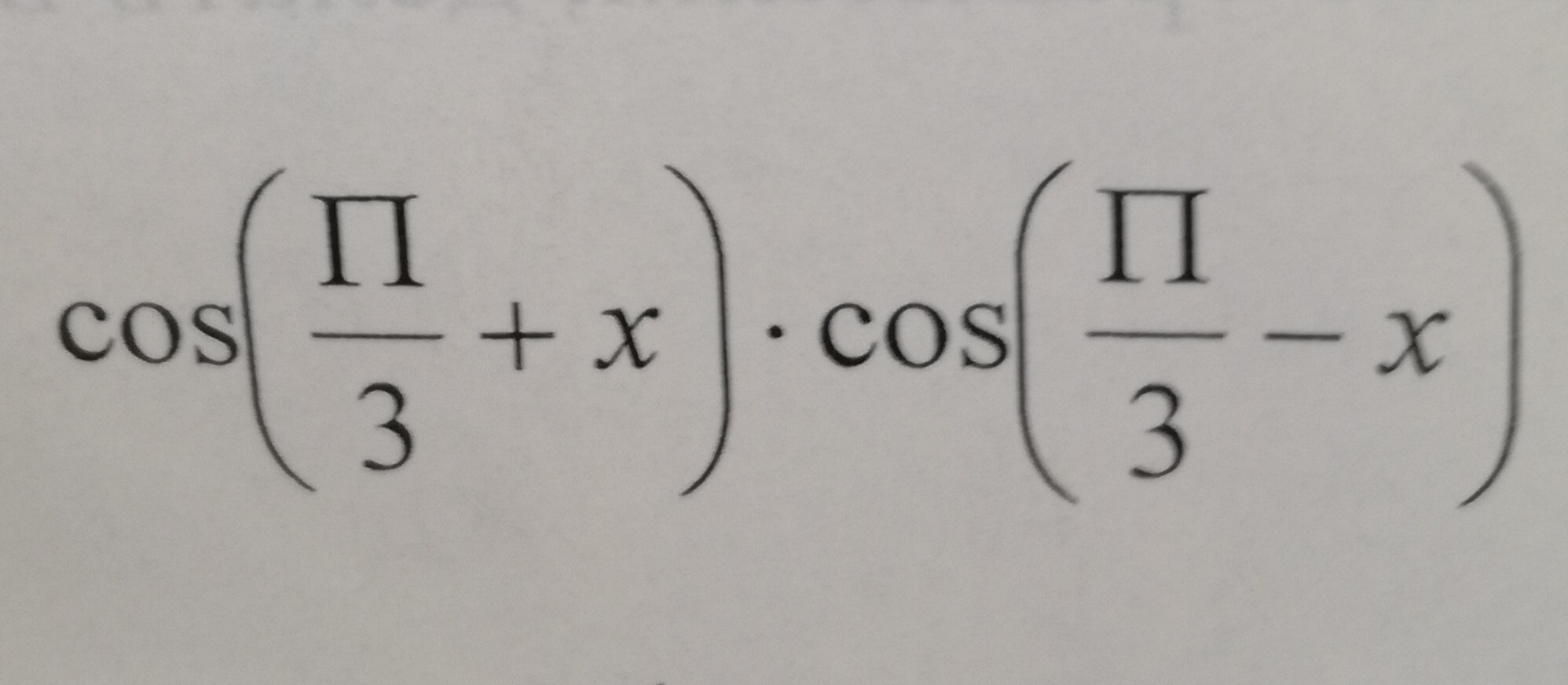 cos(pi/3+x)*cos(pi/3-x)=1/2*(cos2x)+cos(2pi/3))=1/2*(cos2x-1/2)