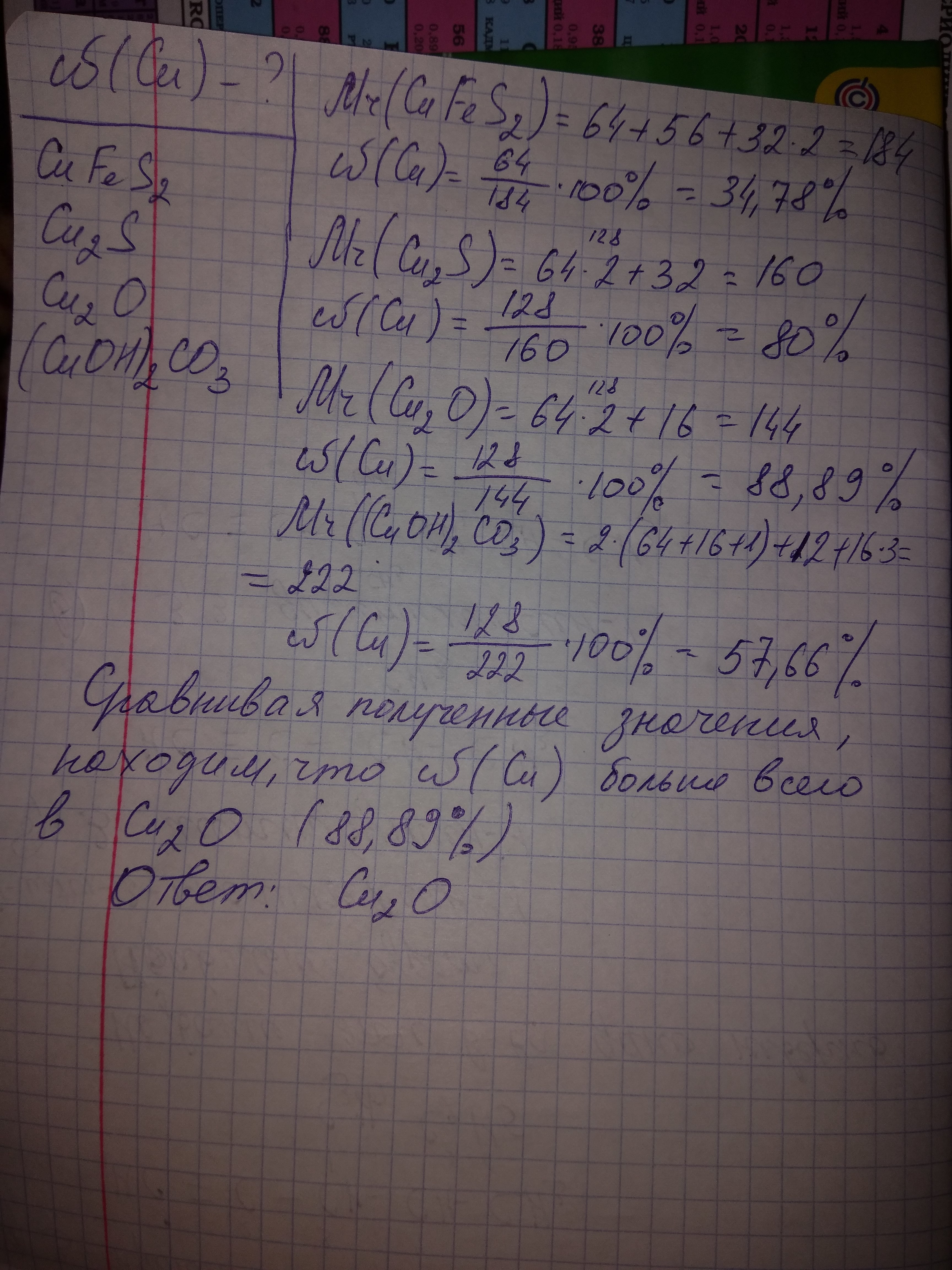 Медь в чистом виде в природе встречается редко. Медные руды содержат, кроме собственно меди, различные другие элементы. Чаще всего в рудах медь находится в соединении с серой - медный колчедай CuFeS2 и медный блеск Cu2S. Кроме того медь добывают из окисленных руд куприт Cu2O, малахит (CuOH)2CO3. Вычислите в каком соединении большее содержание меди.