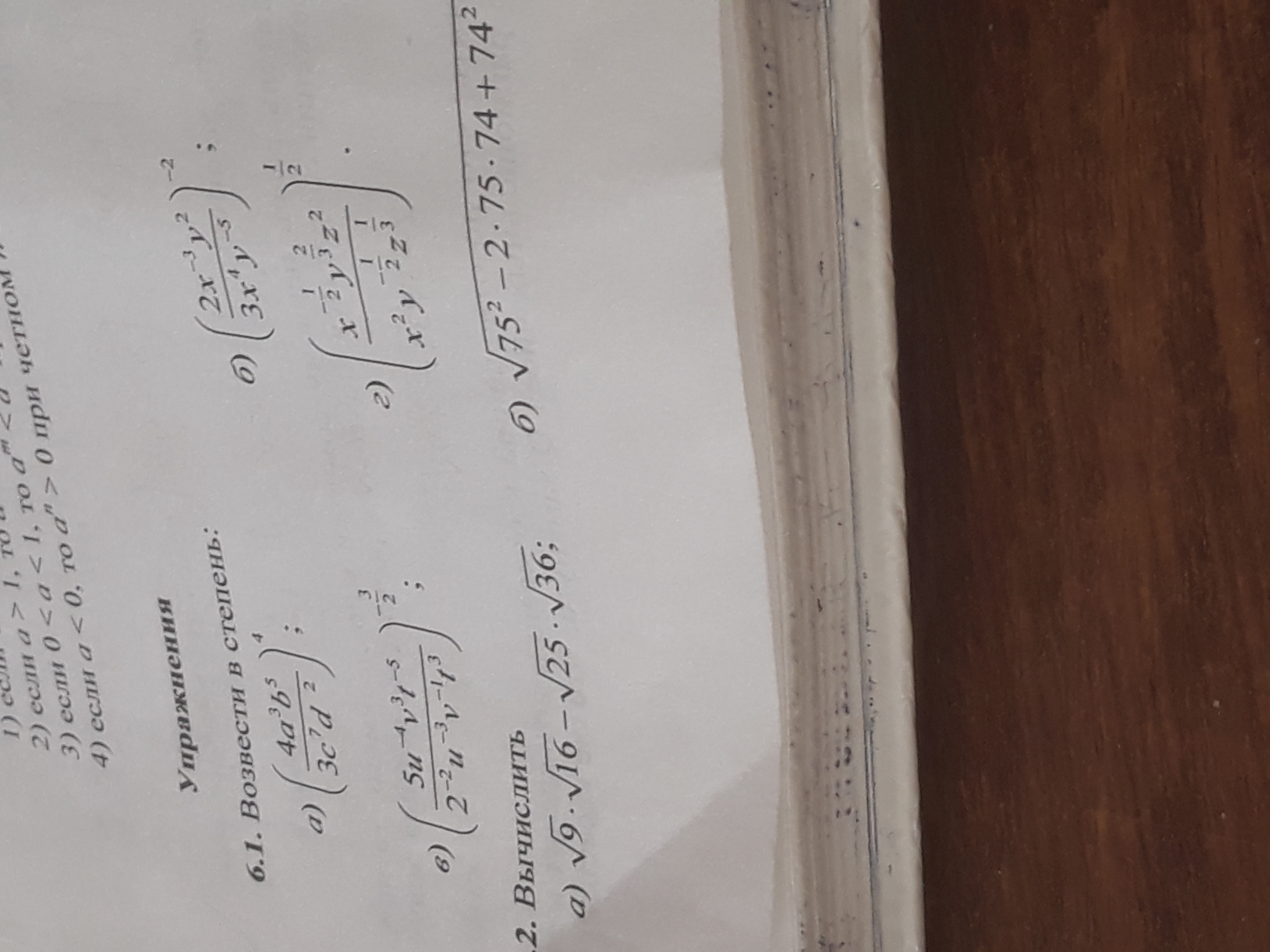 Big (frac{5, u^{-4}v^3, t^{-5}}{2^{-2}, u^{-3}, v^{-1}, t^3}Big )^{-3/2}=Big (frac{5, u^{-1}, v^{4}, t^{-8}}{frac{1}{4}}Big )^{-3/2}=(20)^{-3/2}, u^{3/2}, v^{-6}, t^{12}=frac{u^{3/2}, t^{12}}{20^{3/2}, v^6}\\Big (frac{x^{-1/2}, y^{2/3}, z^2}{x^2, y^{-1/3}, z^{1/3}}Big )^{1/2}=Big (frac{ycdot z^{5/3}}{x^{5/2}}Big )^{1/2}=frac{y^{1/2}, z^{5/6}}{x^{5/4}}\\6.2); ; sqrt9cdot sqrt{16}-sqrt{25}cdot sqrt{36}=3cdot 4-5cdot 6=12-30=-18\\sqrt{75^2-2cdot 75cdot 74+74^2}=sqrt{(75-74)^2}=sqrt{1^2}=1}
