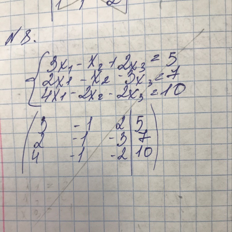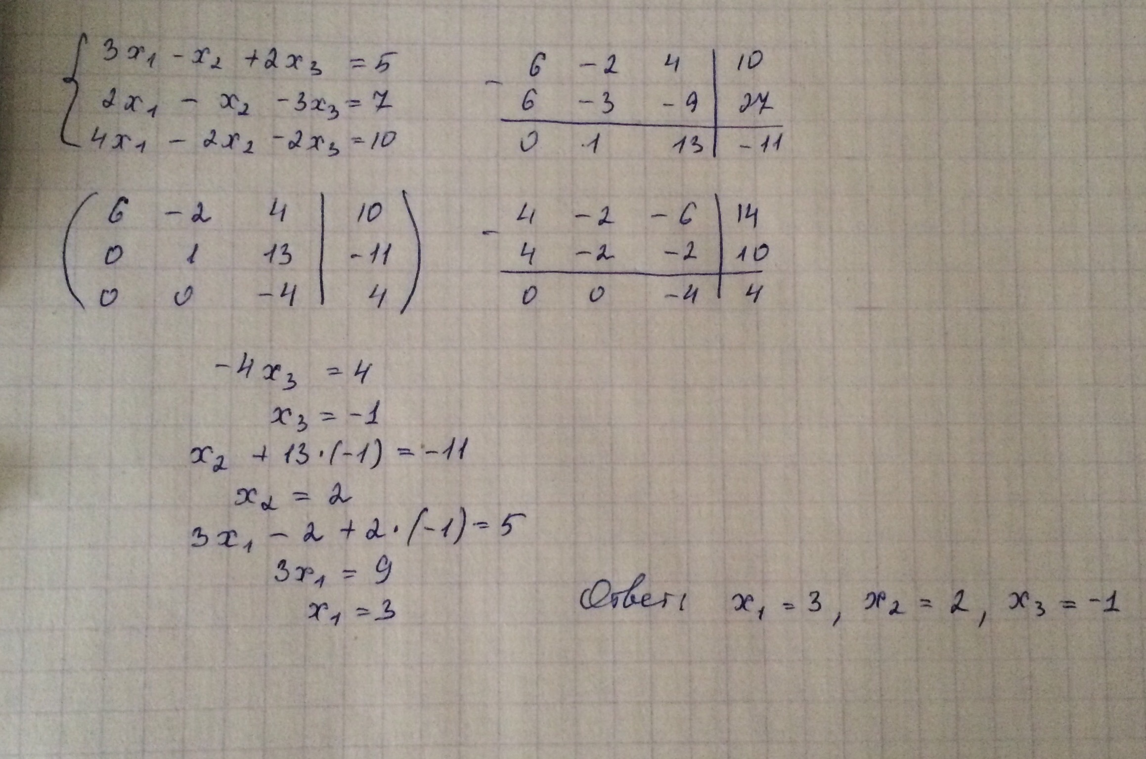 Первую строчку умножим на 2, вторую на 3 и вычтем из первой строчки вторую. Одновременно вторую строчку умножим на 2 и вычтем из неё третью строчку.