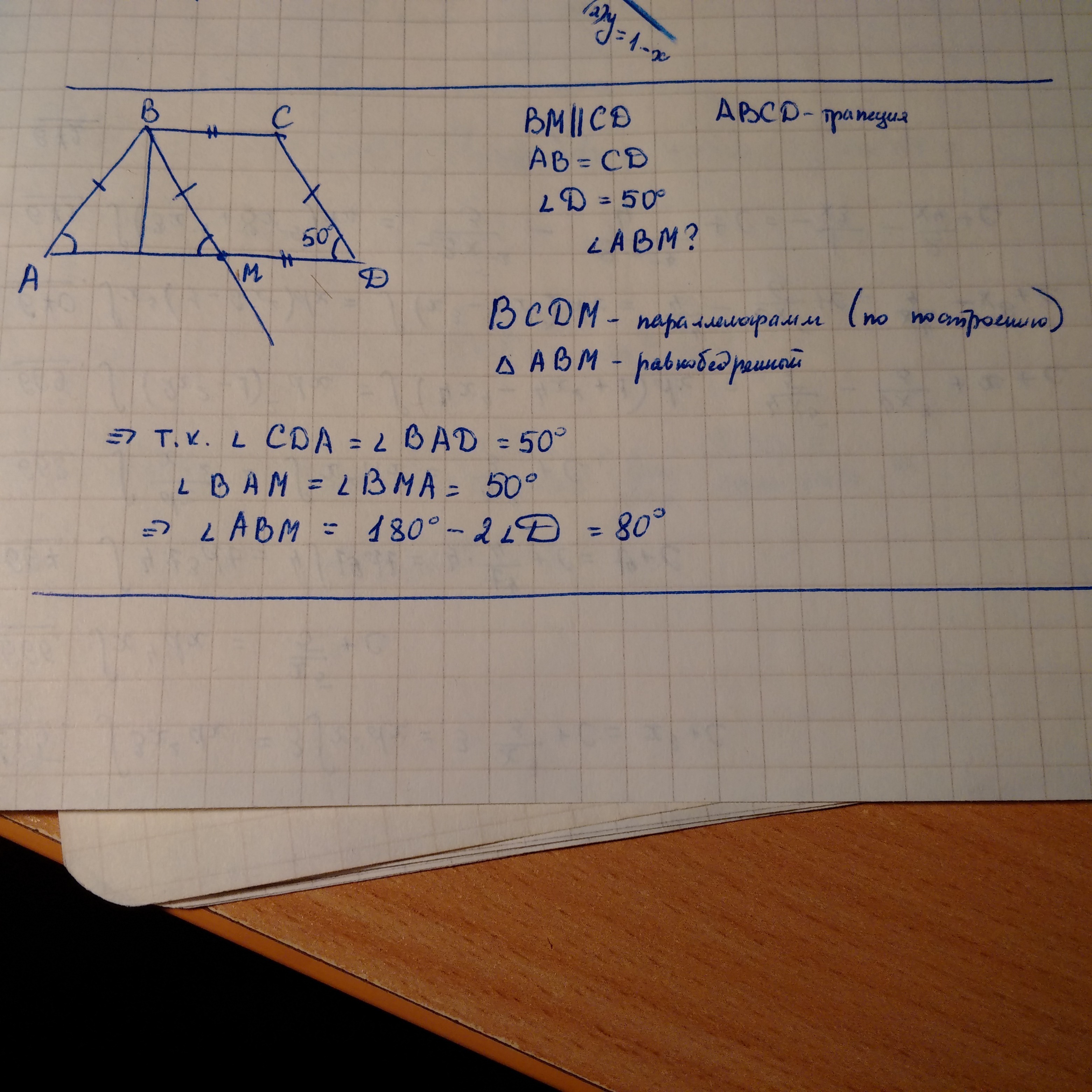 в равнобокой трапеции ABCD с основаниями AD и BC из вершины тупого угла B проведена прямая, параллелограмм боковой стороны CD и пересекающая сторону AD в точке M. Найдите угол треугольника ABM если угол D=50градусов