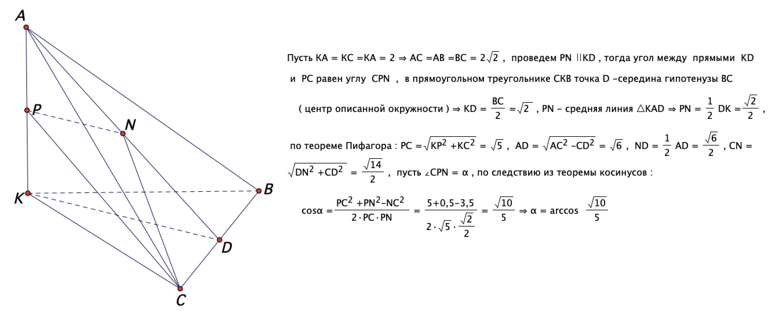 В правильной треугольной пирамиде KABC все плоские углы при вершине K прямые. Точки P и D середины ребер KA и BC соответственно. Найдите угол между прямыми CP и KD