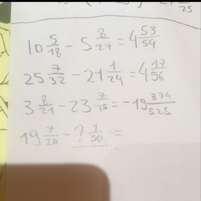 выполните действия 10 целых 5/18 минус 5 целых 8/27;25 целых 7/32минус21 целых1/24; 3 целых 8/21 минус 23 целых7/15;19 целых7/20 минус целых1/30;