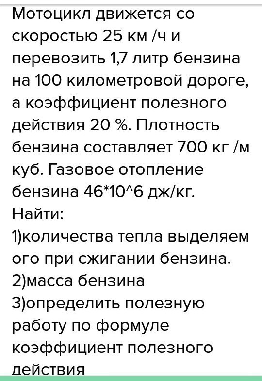 Задача: сгорело 1,7 л бензина с удельной теплотой сгорания 46*10⁶ Дж/кг и плотностью 700 кг/м³. КПД=20%.