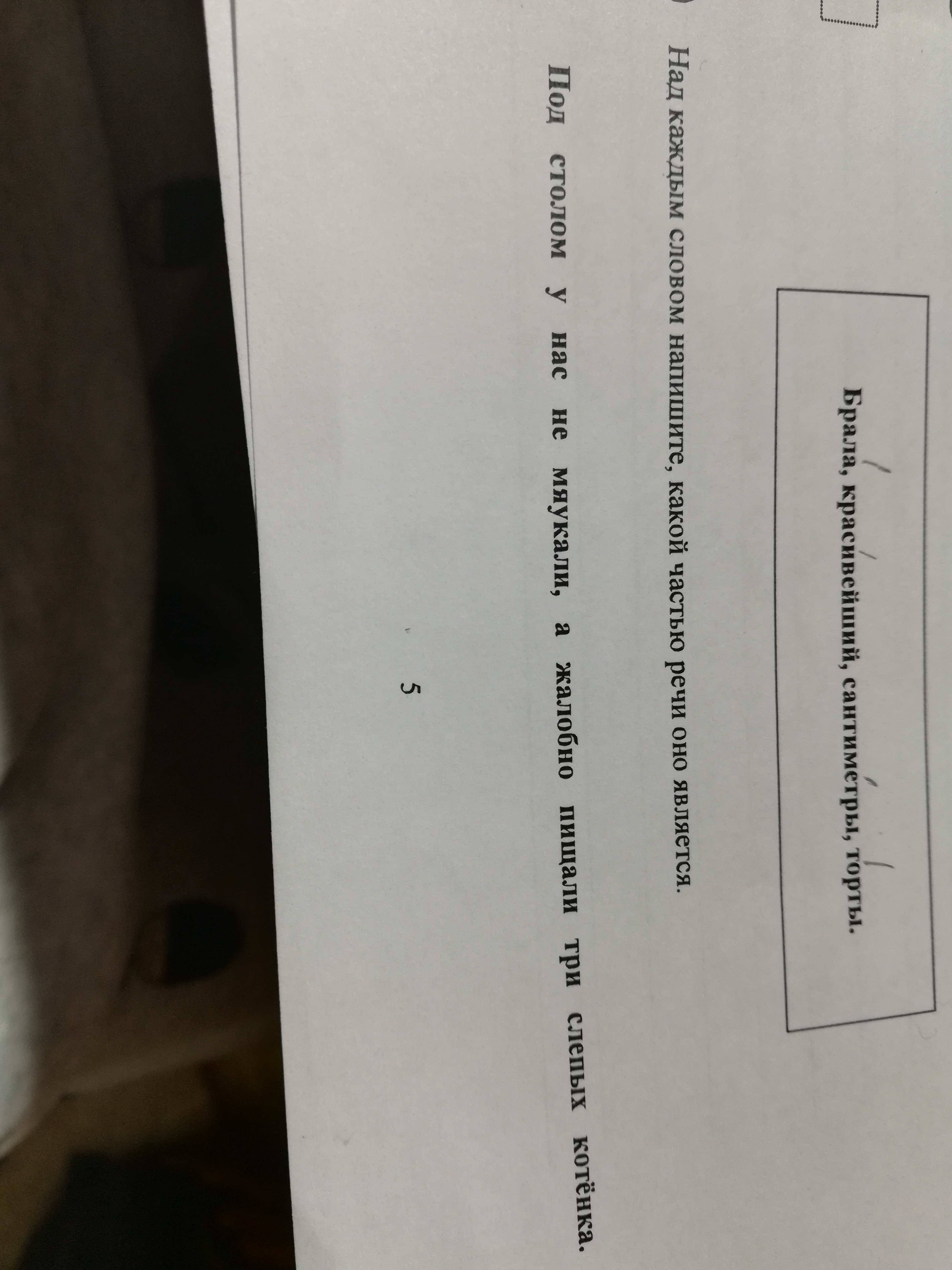 Под(предлог) столом(сущ) у(предлог) нас(местоимение) не(частица) мяукали(глагол), а(союз) жалобно(наречие) пищали(глагол) три(числит) слепых(прилаг) котёнка(сущ).