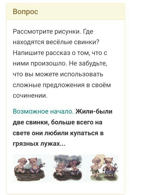 2)Жили-были две свинки, больше всего на свете они любили купаться в грязных лужах. Как-то раз они сидели в такой луже, и вдруг пошел дождь. У одной свинки был с собой зонтик, который она тут же раскрыла, но зонтика не было у второй свинки. Она сидела под дождем. Вскоре он закончился. Свинка с зонтиком оказалась очень грязной, а ее подруга была чистой, потому что она помылась под дождем.