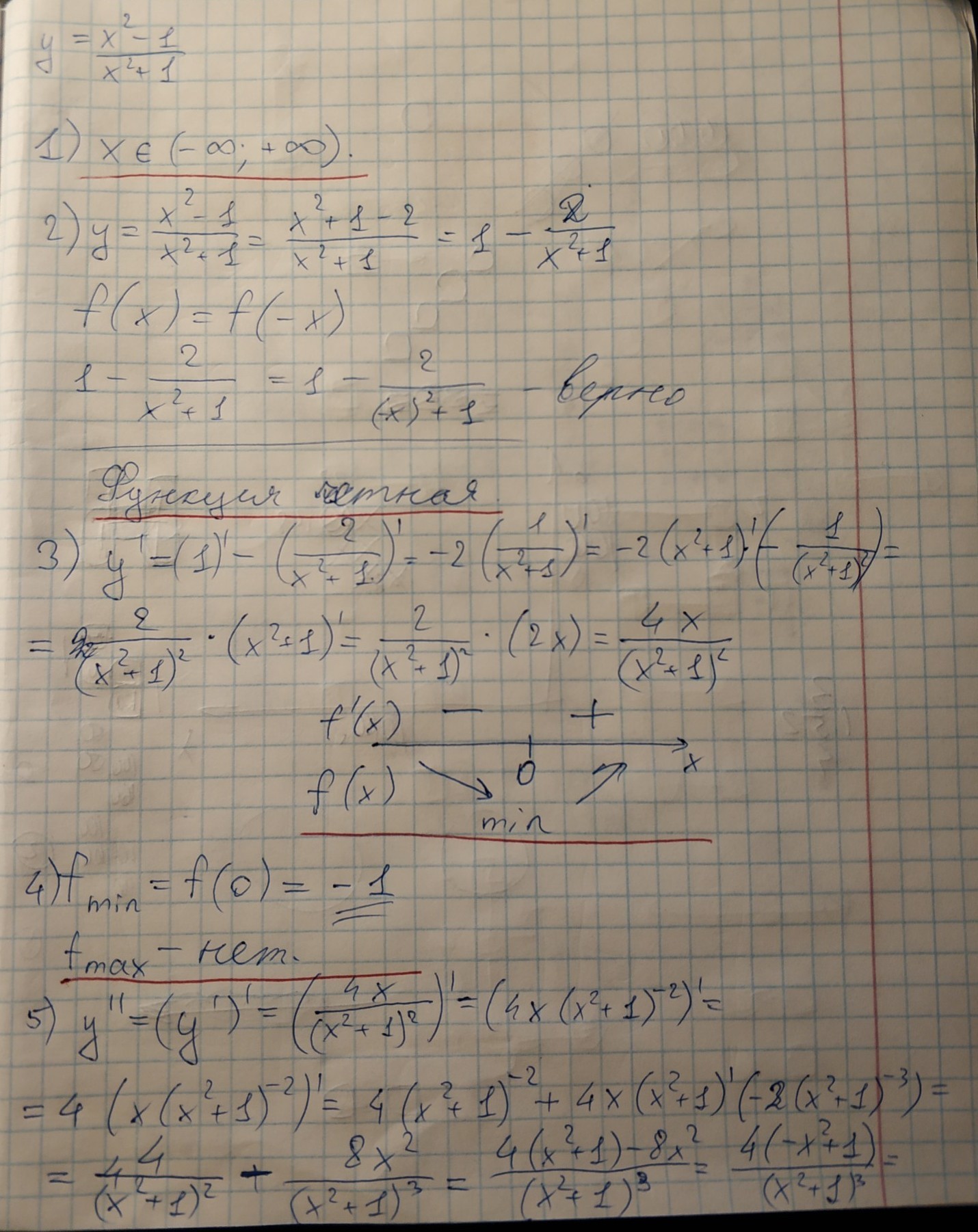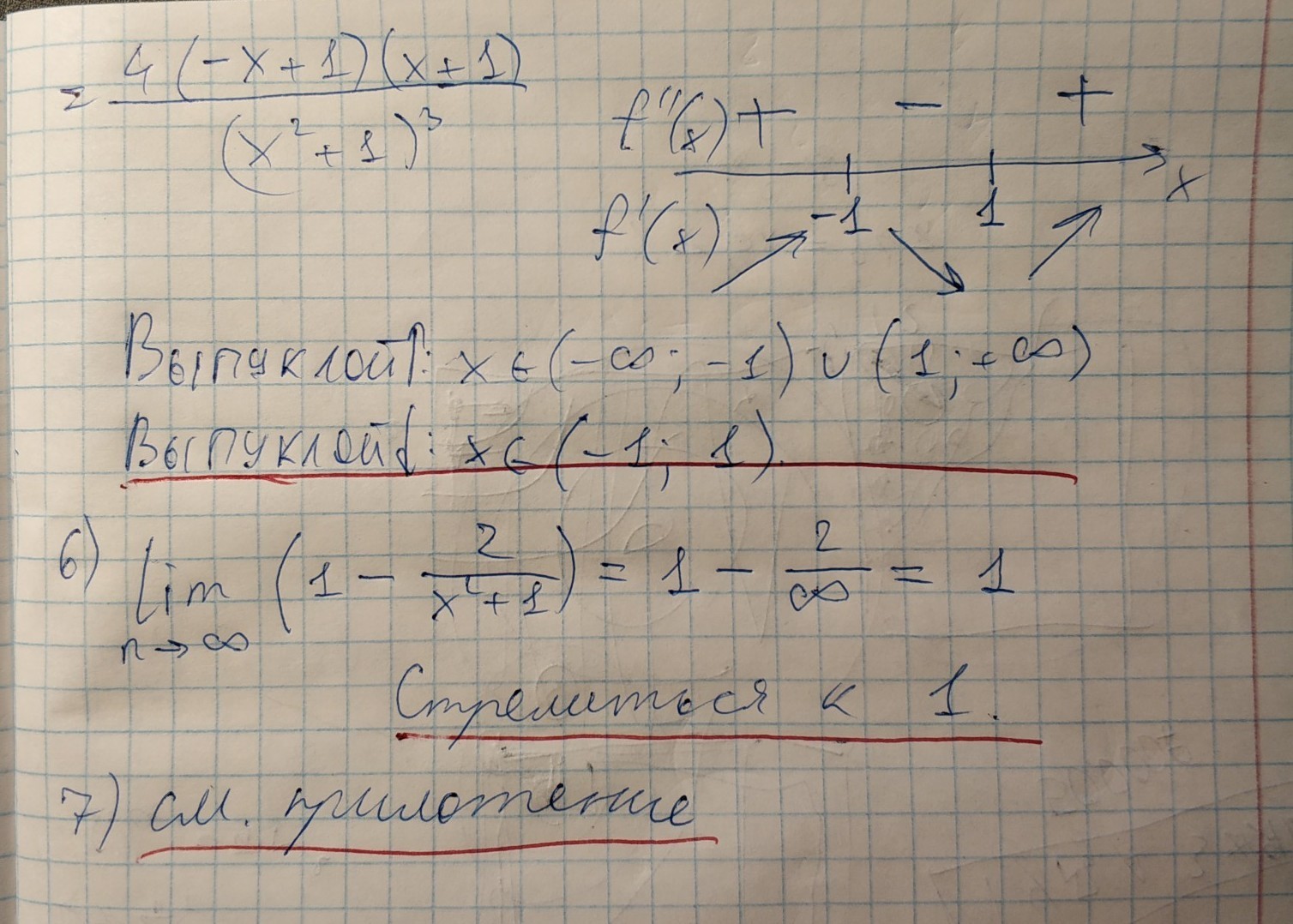 Не совсем понятен пятый пункт. Вторая производная же (-12x^2+4)/(x^2+1)^3. Даже в photomath так