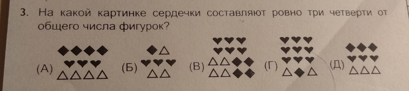 д)9 всего,6 ненужных,3 сердец,3/9=1/3 не равно 3/4.