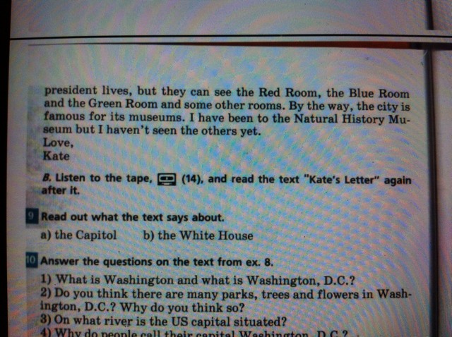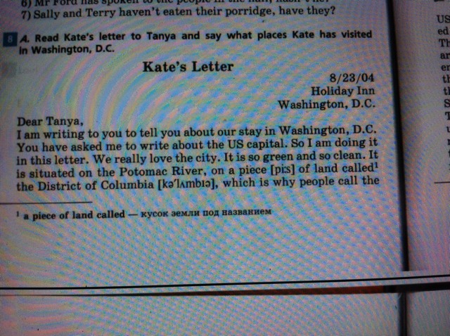 ДОрогая Таня. Пишу вам, чтобы рассказать о вашей остановке в Вашингтоне, (буквами, кажется, штат назван, не помню как это расшифровывается). Вы просили меня написать о столице США.Поэтому я делаю это в этом письме. Мы по-настоящему любим этот город. Он так зелен и чист. Он расположен у реки Потомак на кусочке суши, называющемся район Колумбия, вот почему люди зовут этот...