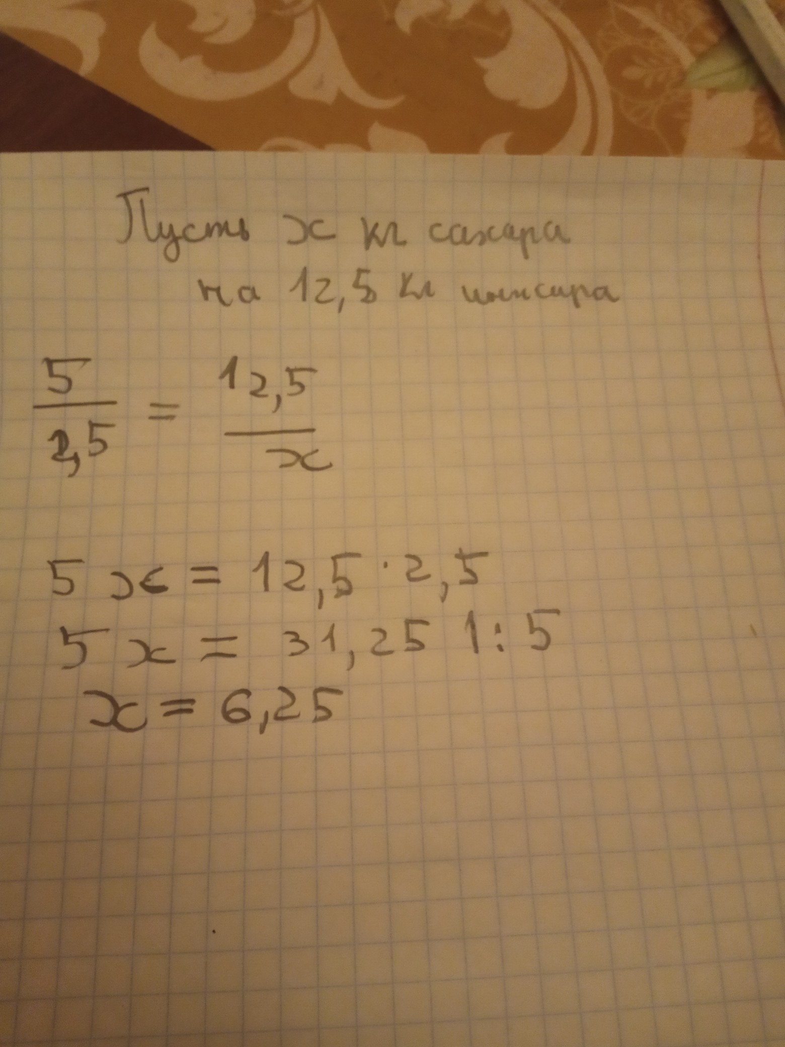Мы соотносим кг инжира с кг сахара.В первом случае 5 кг с 2,5 кг,а во втором мы не знаем сколько кг сахара и обозначаем за х.Также соотносим 12,5 кг инжира с искомым количеством сахара.