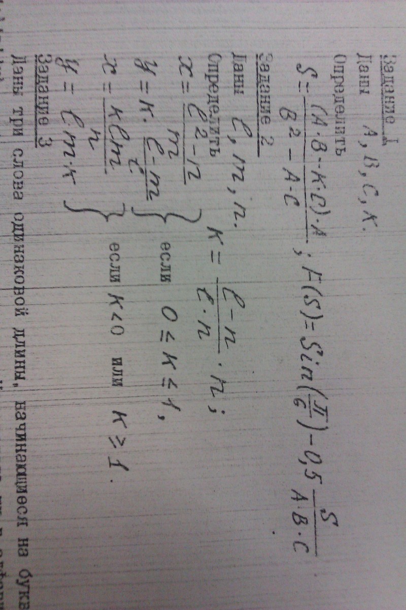 writeln('F(S) = ', sin(3.14 / 6) - 0.5 * S / (a * b * c));