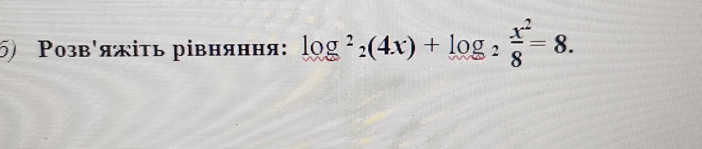 ((log2(4)+log2(x))^2+log2(x^2)-log2(8)=8