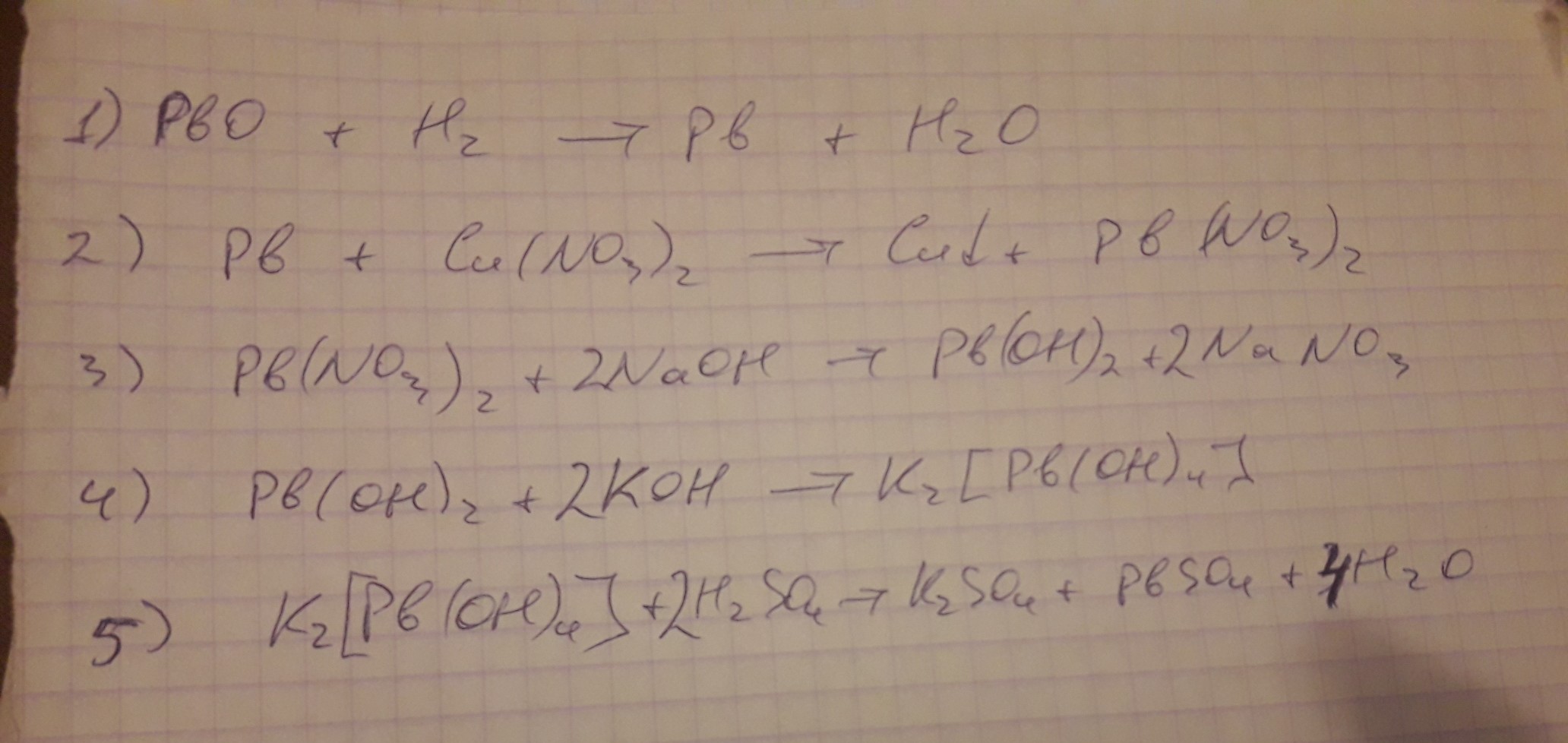 б) PbO → Pb → Pb(NO3)2 → Pb(OH)2 → K2[Pb(OH)4] → K2SO4;