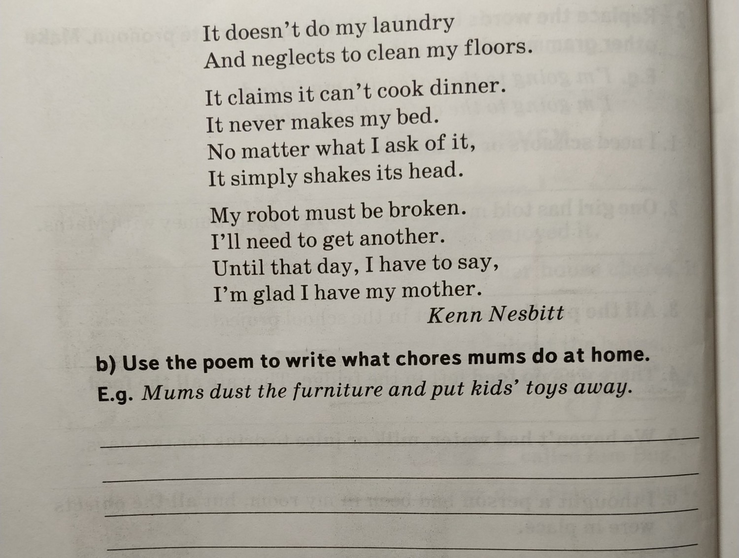 Mums do laundry and clean the floors. Mums cook dinner and make the bed.