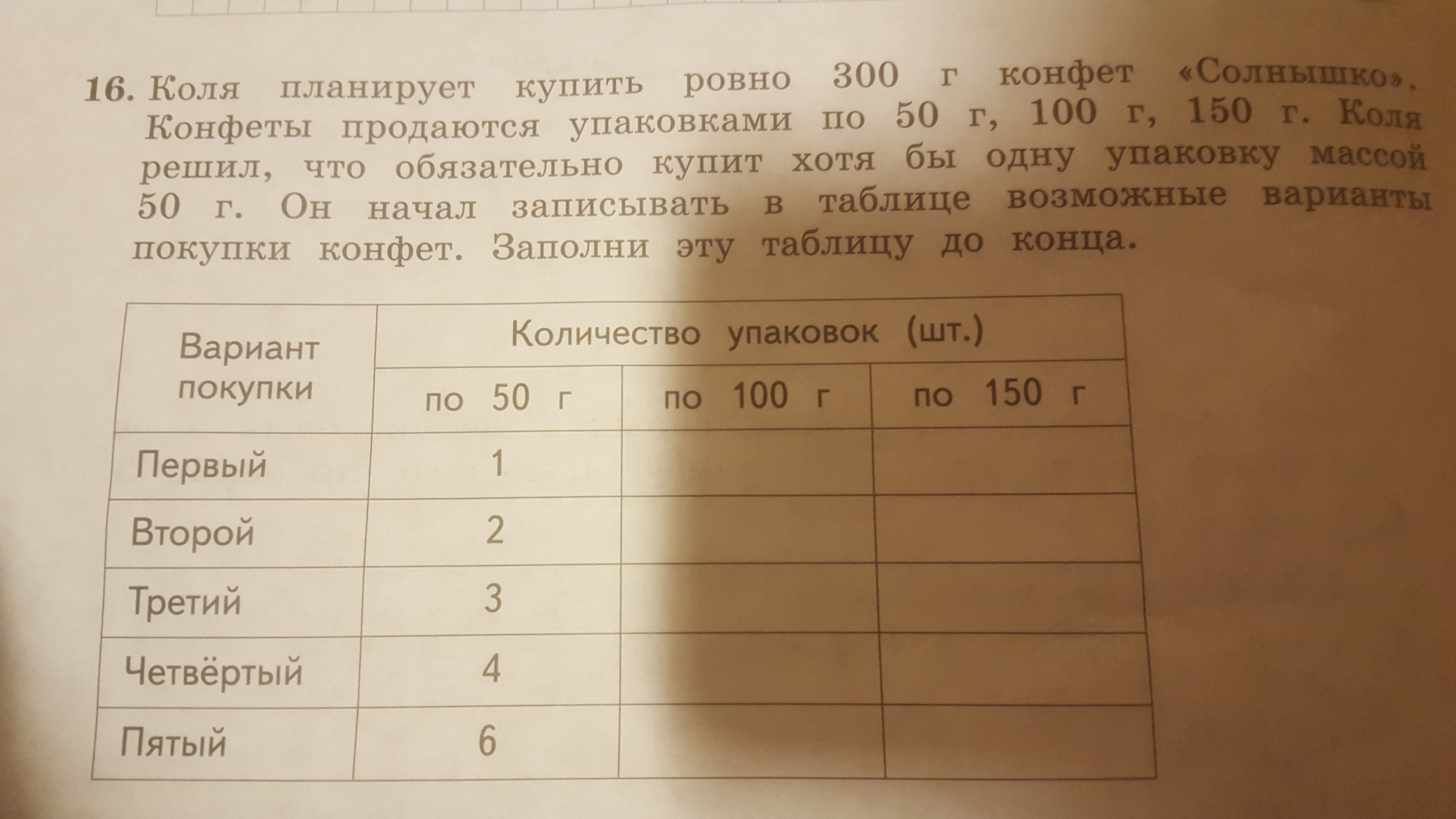 Третий: По 50г - 3, по 100г - 0, по 150г - 1.