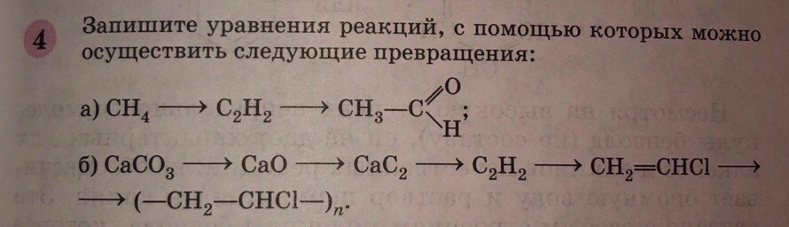 б) CaCO3->CaO->CaC2->C2H2->C2H3Cl->(-CH2-CHCl-)n