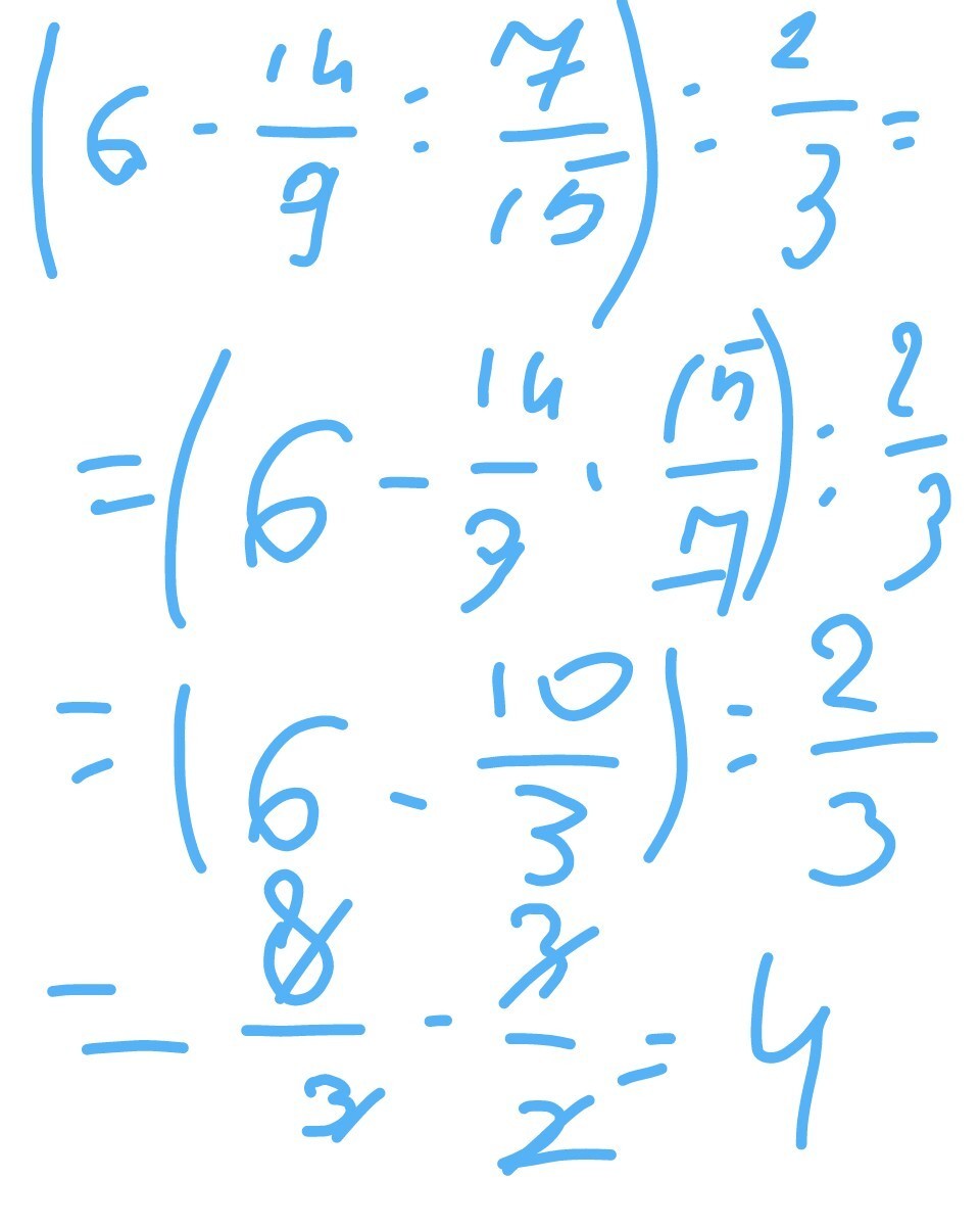 (6-1 5/9:7/15):2/3=(6- 14/9:7/15):2/3=(6-14/9*15/7)*3/2=(6-2/3*5/1)*3/2=(6-10/3)*3/2=(2 2/3)*3/2=8/3*3/2=4