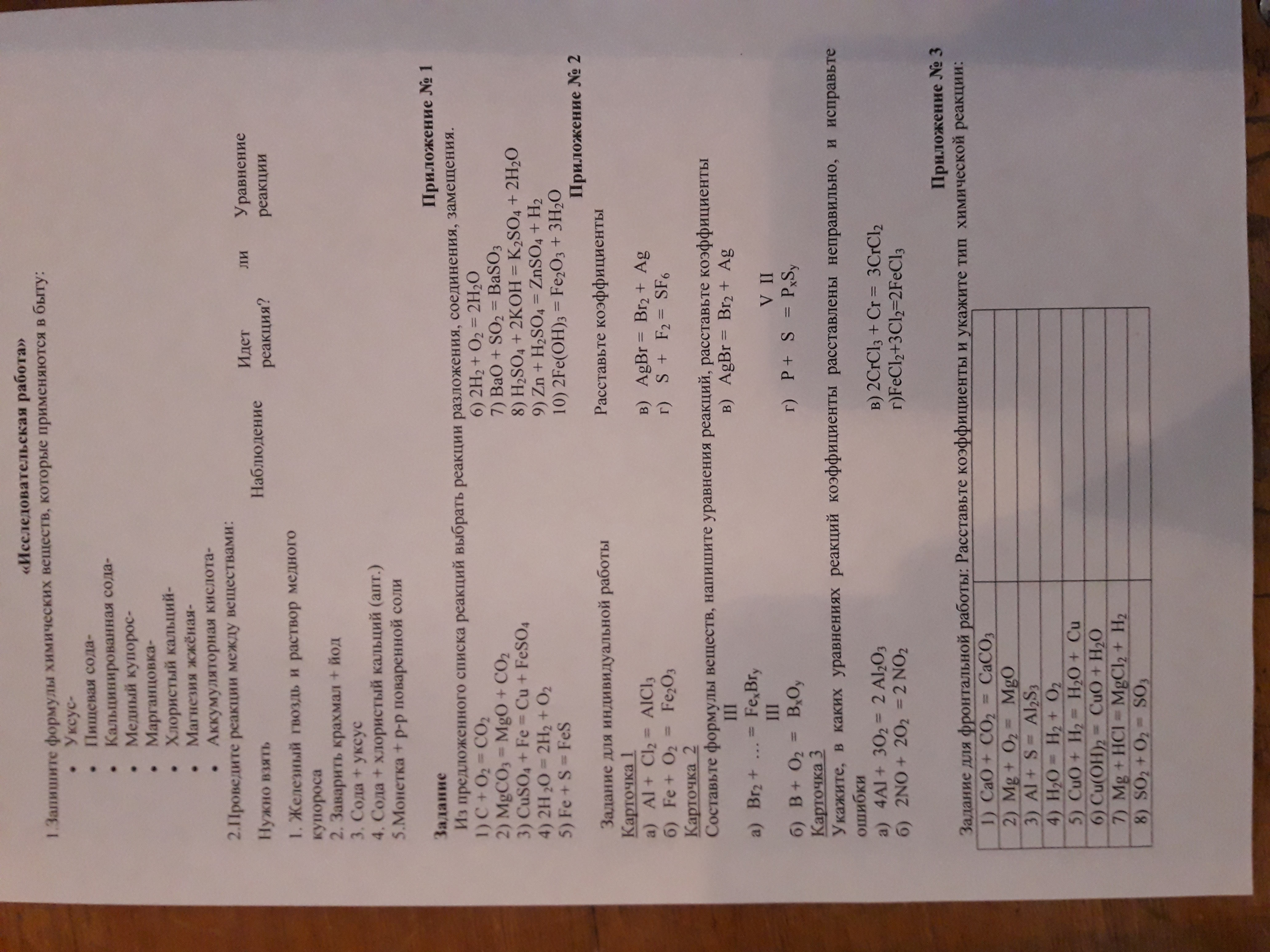 Приложение 1: из предложенного списка реакций выбрать реакции разложения, соединения, замещения.