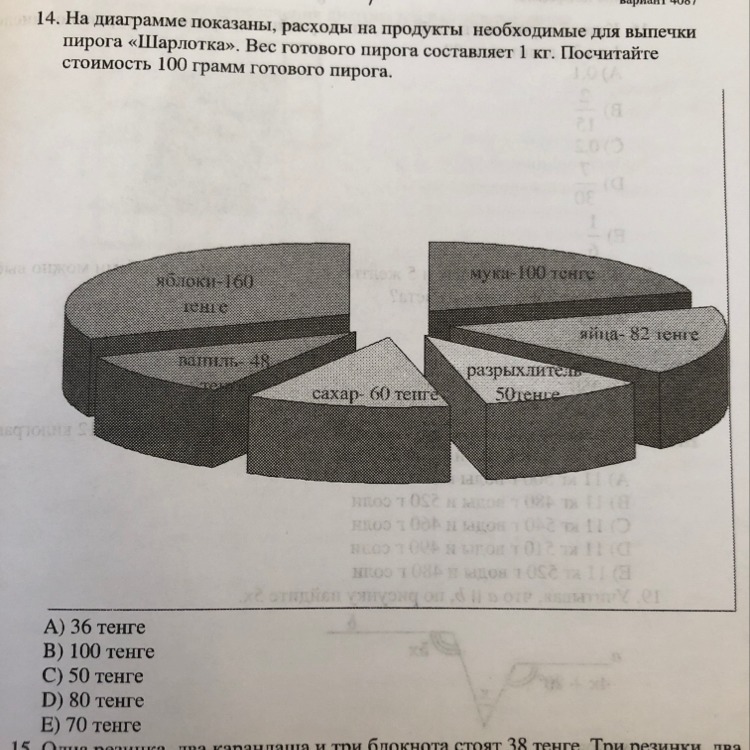 На диаграмме показаны,расходы на продукты необходимые для выпечки пирога «шарлотка».Вес готового пирога составляет 1кг.Посчитайте стоимость 100 грамм готового пирога