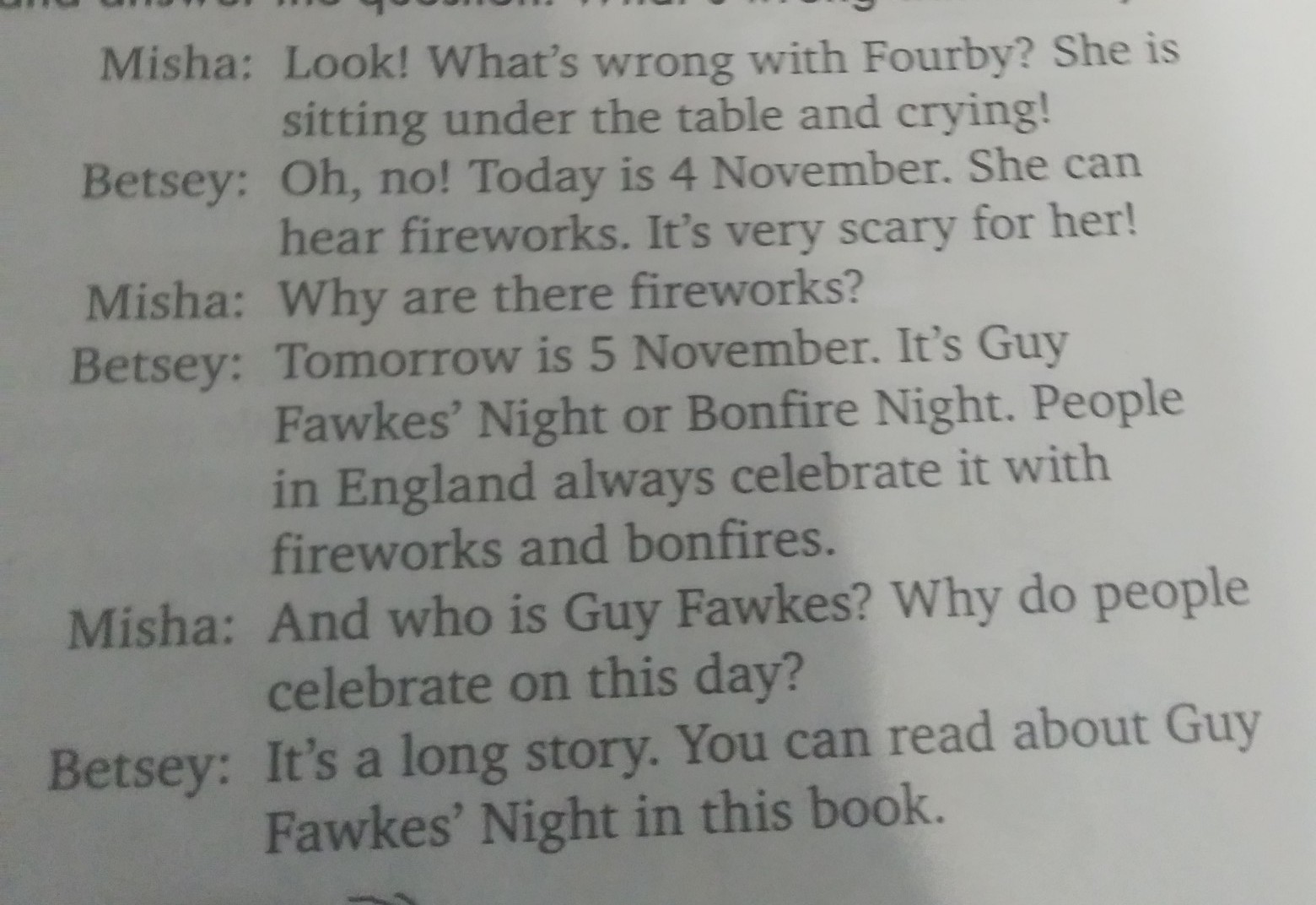 Б: Завтра 5-е ноября. Сегодня Ночь Гая Фокса или Ночь Костра. Люди в Англии всегда отмечают её фейерверками и кострами.