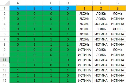 - =И(ИЛИ(B; C; D); ИЛИ(A; D; C))